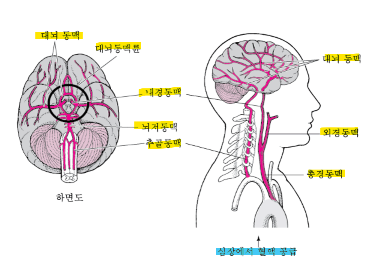 혈액은 다음과 같이 두 쌍의 큰 동맥을 통해 뇌로 공급되는데 동맥 줄기는 뇌의 모든 부분에 혈액을 전달합니다.뇌에 혈액을 공급하는 큰 동맥이 차단될 경우 일부 환자에게서는 증상이 전혀 없거나 경미한 뇌졸중이 발생하기도 합니다. 그러나 유사한 방식으로 혈관이 차단된 다른 환자에게서는 심각한 허혈성 뇌졸중이 발생하기도 합니다. 간단히 설명하자면 뇌의 동맥줄기로 혈액을 전달하는데 그 통로가 차단되면... 뇌졸중이 발생하게 됩니다.